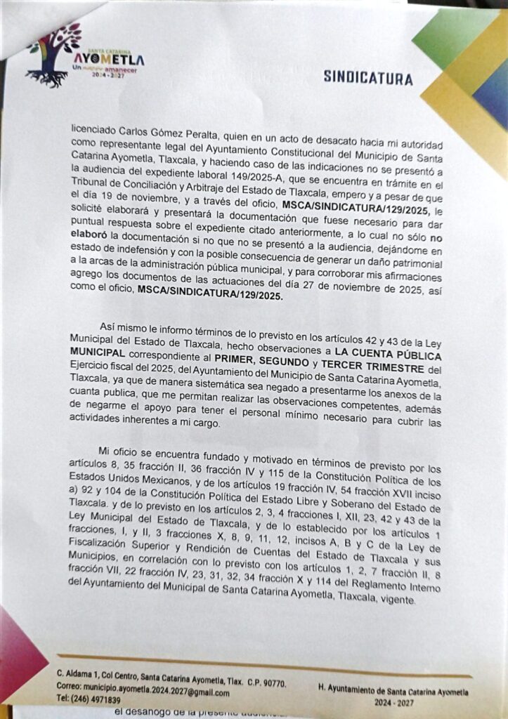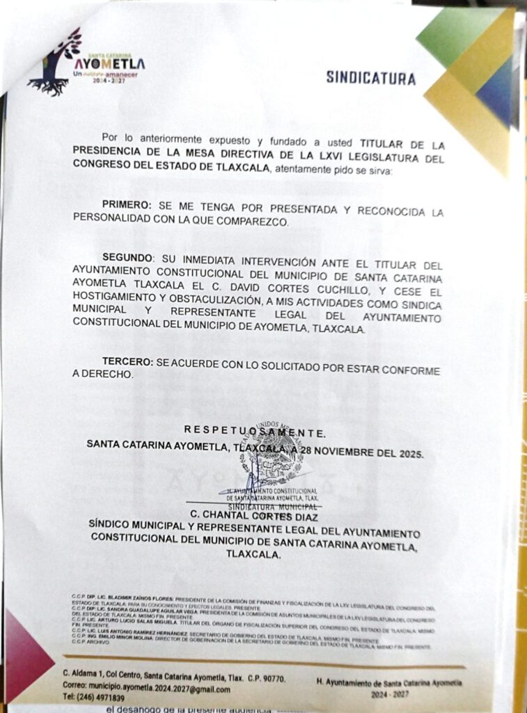 La Síndico del municipio de Ayometla, Chantal Cortes Díaz, envío al Congreso del Estado un oficio en el que denuncia al alcalde, David Cortes Cuchillo, por ejercer ataques en contra de su persona y obstaculizar sus labores como funcionaria municipal.