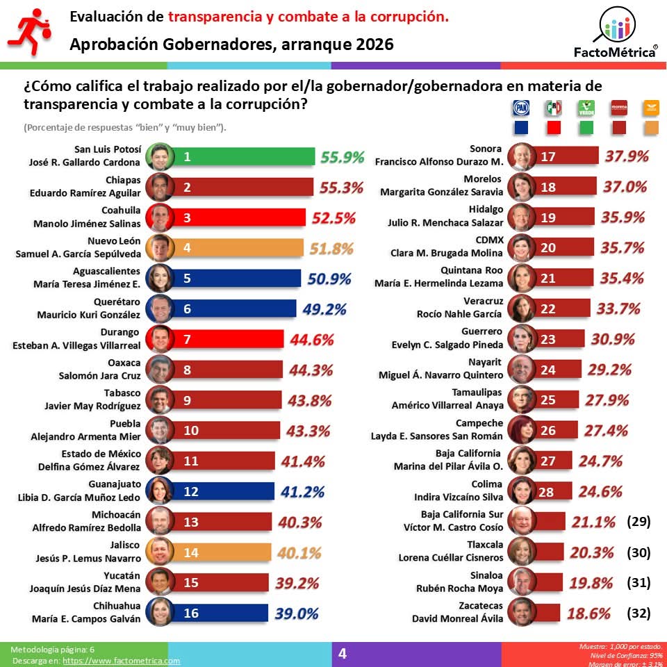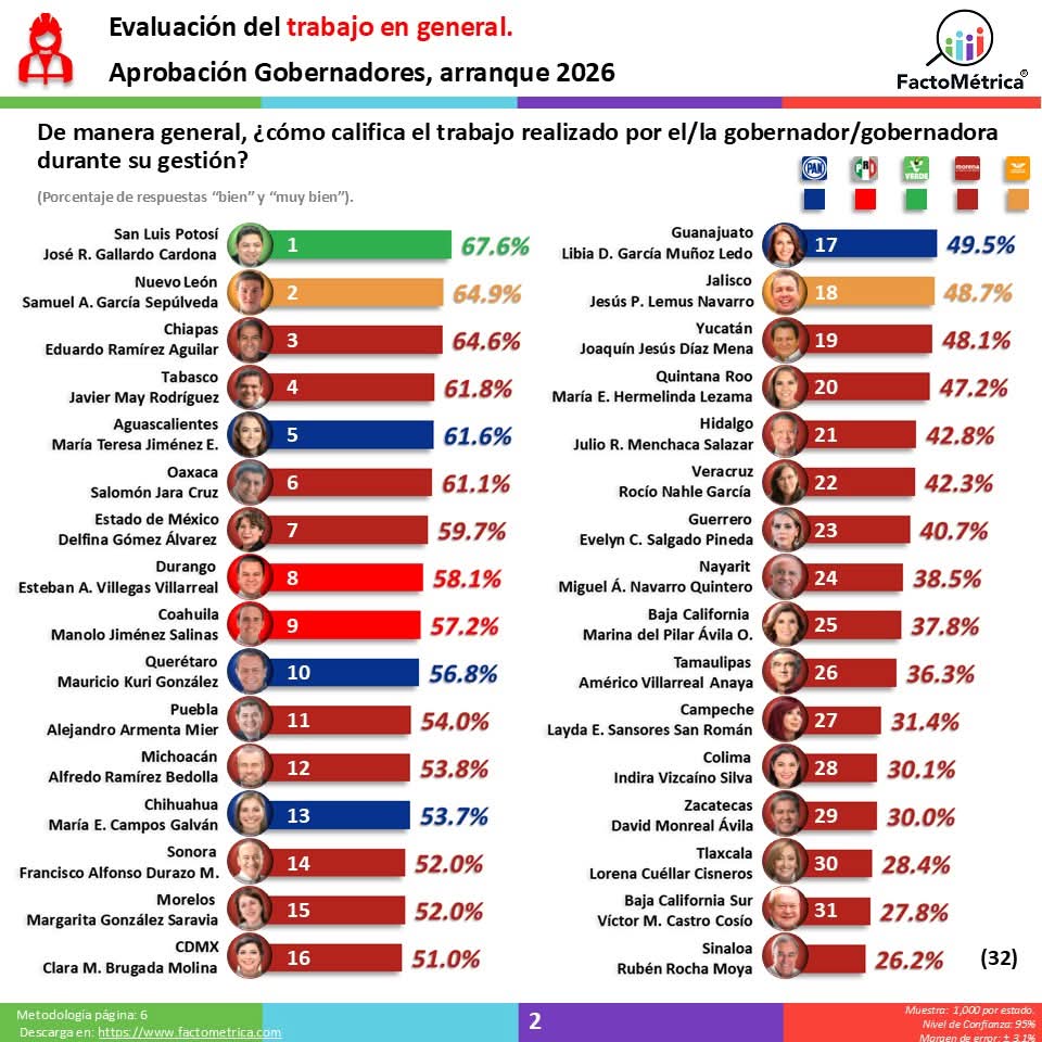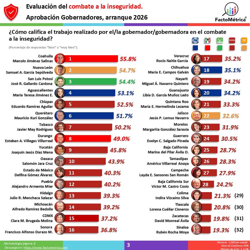 En cuanto a su gestión general, Cuéllar Cisneros se mantiene en la posición número 30 con el 28.4 por ciento, lo que la consolida como una de las peor evaluadas a nivel nacional en el arranque del 2026.