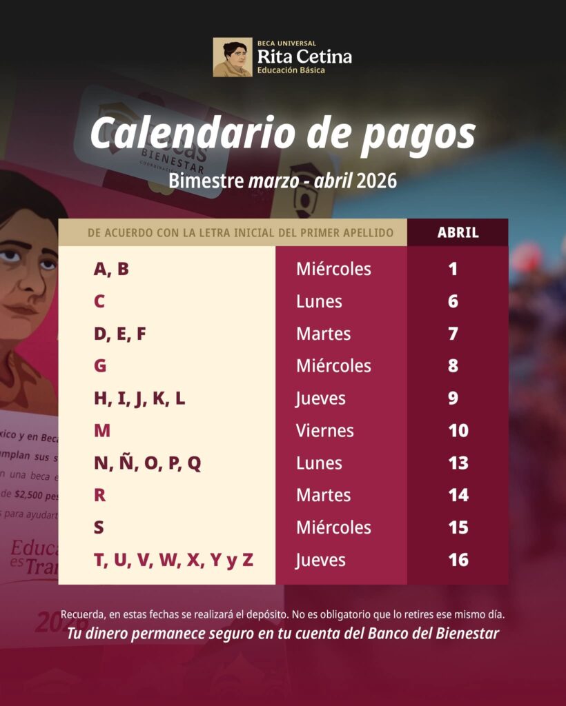 En este sentido, Bautista Vásquez indicó que las y los 54 mil 88 beneficiarios de las becas “Benito Juárez” y 5 mil 22 “Jóvenes Escribiendo el Futuro” recibirán sus apoyos del 13 al 24 de abril, cubriendo los bimestres acumulados de enero a abril. Para estos programas, el orden de pago se determina según la letra inicial del primer apellido de la o el estudiante.
