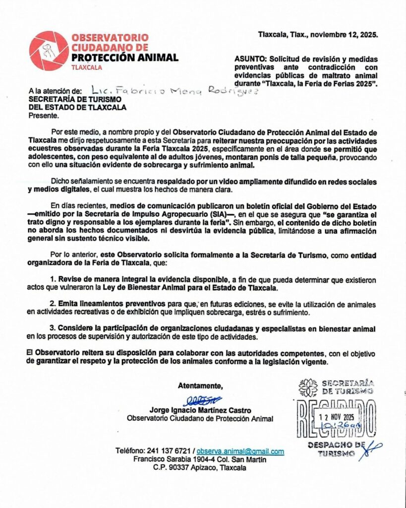 El Observatorio Ciudadano de Protección Animal del Estado de Tlaxcala (OCPA), informó que este miércoles entregó de manera formal un escrito dirigido a la Secretaría de Turismo del Estado (SECTUR), en el cual solicita la revisión de los hechos documentados en video durante la Feria Tlaxcala 2025, donde se observó la utilización de ponis de talla pequeña montados por adolescentes con peso equivalente al de adultos jóvenes, situación que representa sobrecarga y sufrimiento para los animales.
